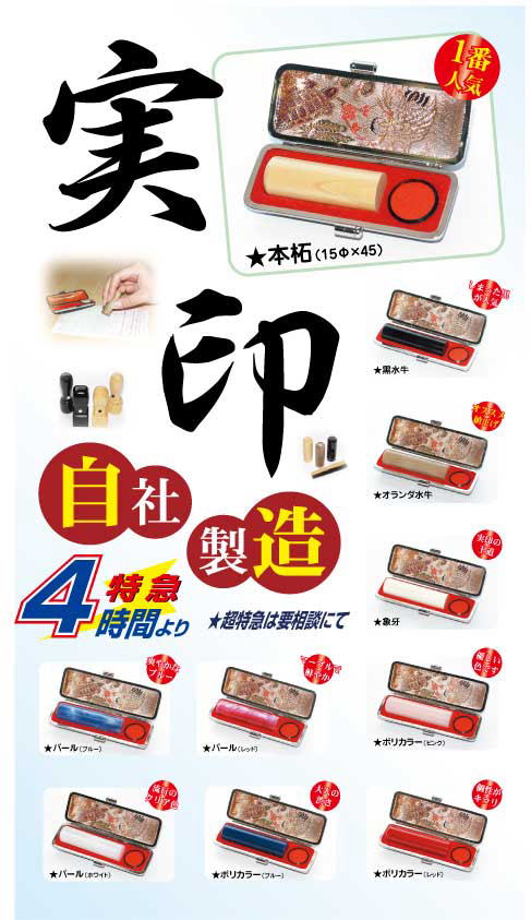 当店は自社で実印を彫っております。最近では彫刻機を2台体制にしてお客様の納期にできるだけ応えられるように努力しております。特急4時間から。それ以上お急ぎの方は、要相談にてお受けいたします。